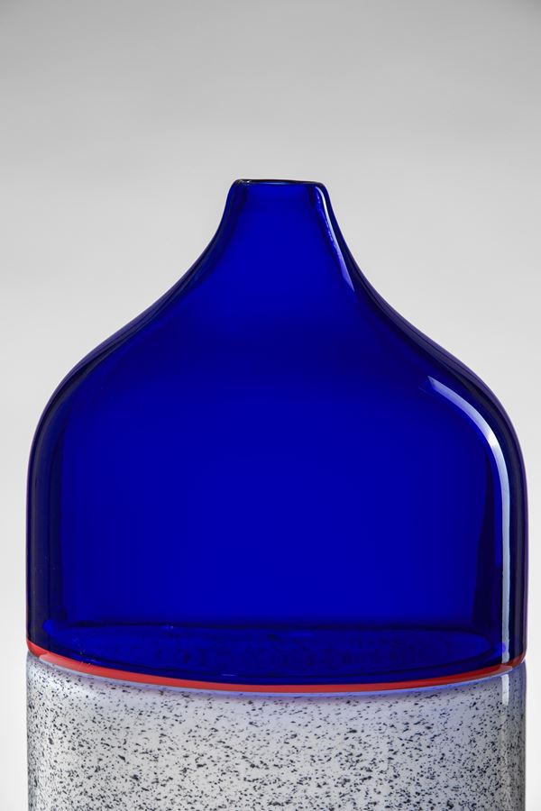 Vetro a doppio incalmo soffiato blu, rosso e grigio a puntini.