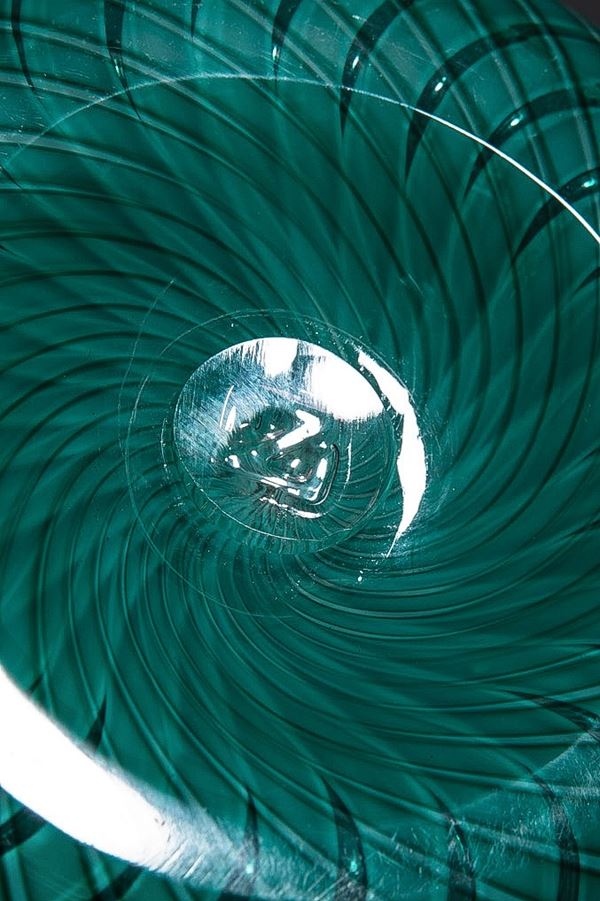 Vetro soffiato a canne incrociate verde e lattimo disposte a doppia spirale.