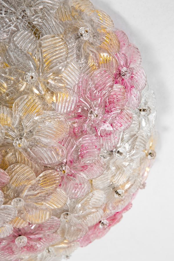 Metallo, elementi floreali in vetro colorato e vetro trasparente con inclusione d'oro.