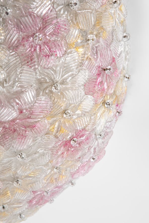 Metallo, elementi floreali in vetro colorato e vetro trasparente con inclusione d'oro.