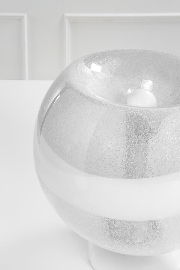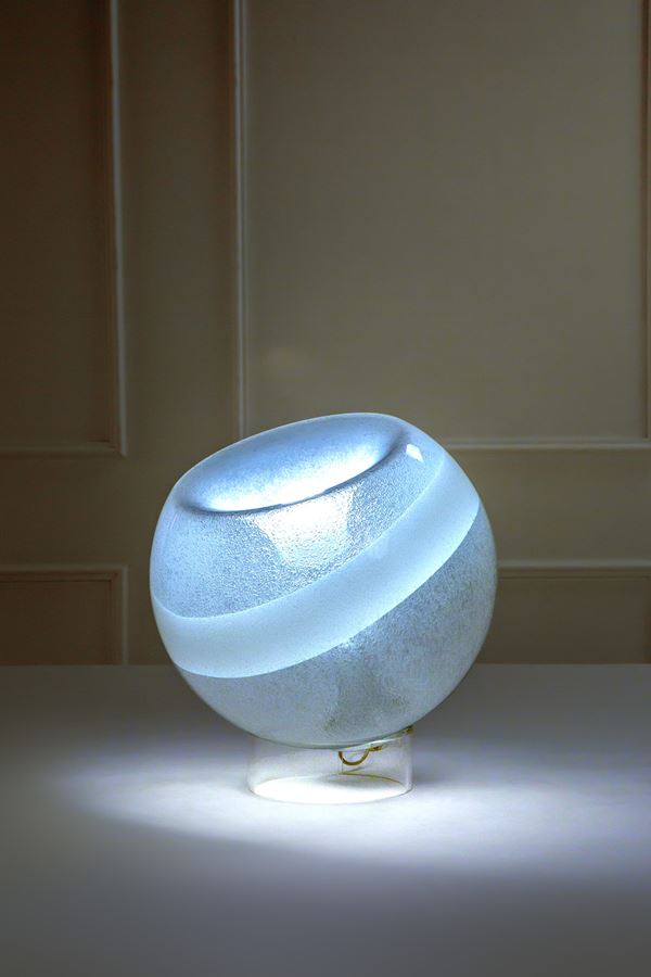 Vetro pulegoso con fascia in vetro lattimo, metacrilato.
