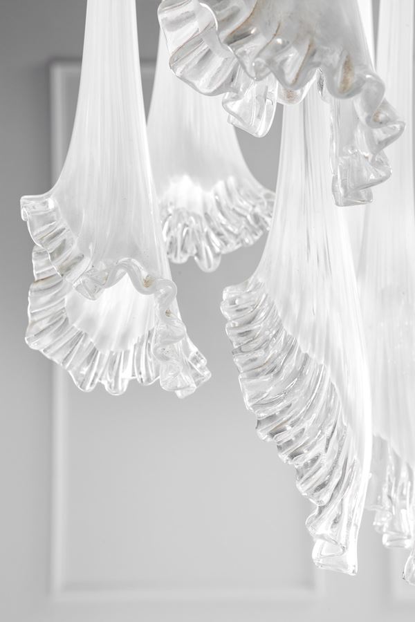 Metallo cromato, elementi in vetro lavorato a caldo lattimo e cristallo a forma di fiore.