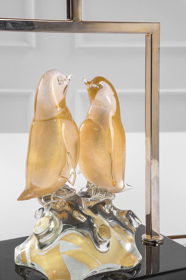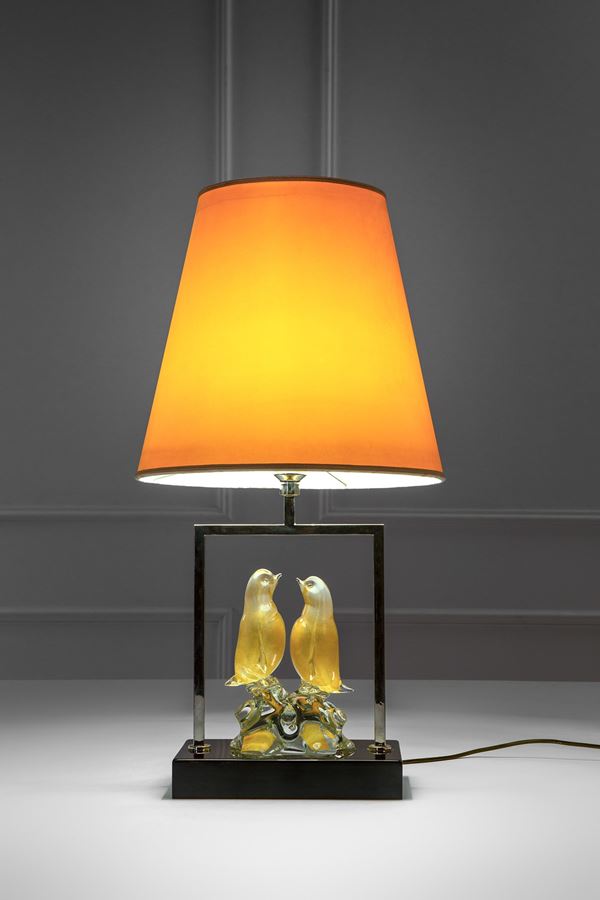Legno laccato, metallo cromato, tessuto, vetro di Murano con inclusione d'oro.