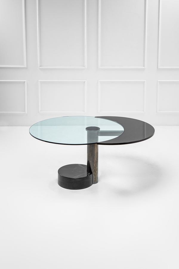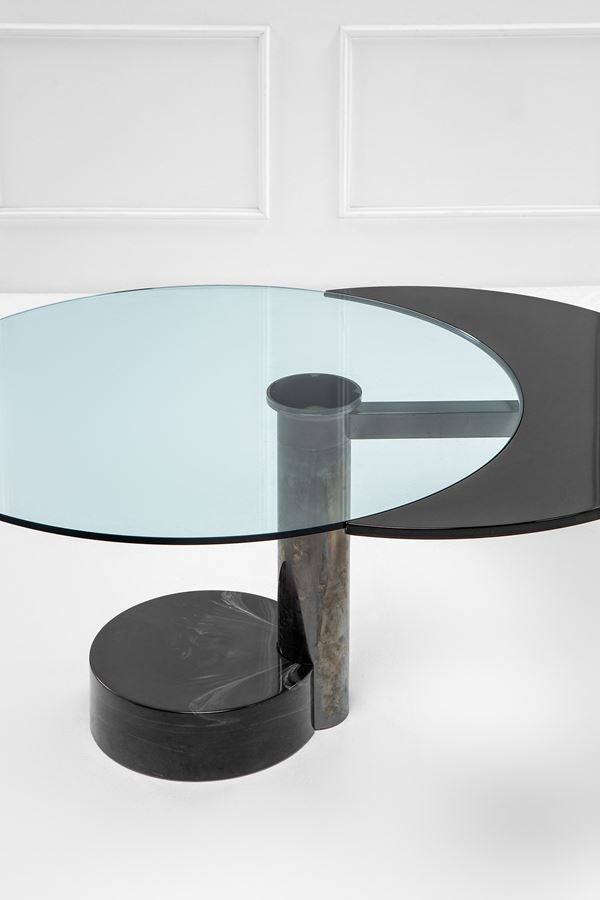 Metallo cromato, cristallo trasparente, legno laccato, marmo.
