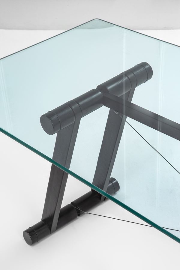Legno massello laccato, piano in cristallo, tiranti in acciaio.