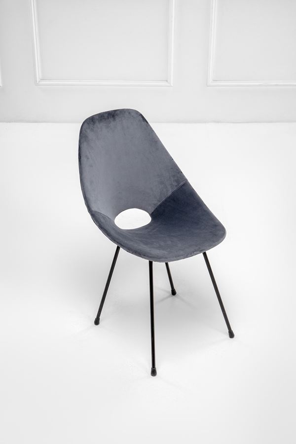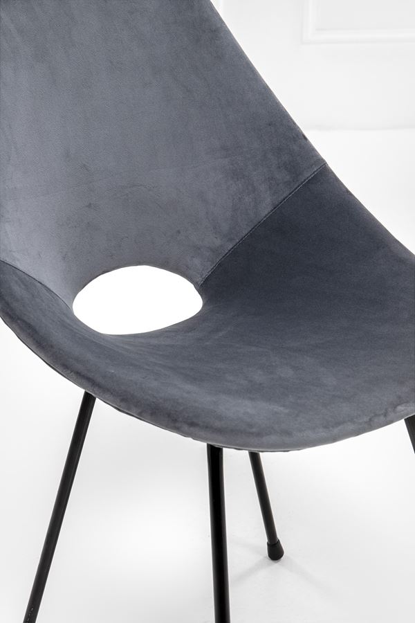 Metallo verniciato, scocca in legno imbottita e rivestita in tessuto.