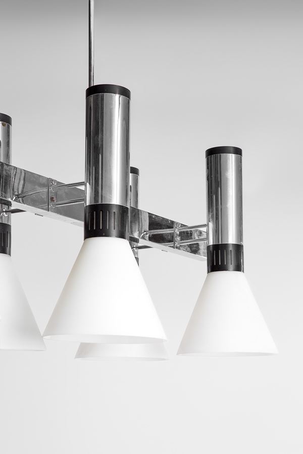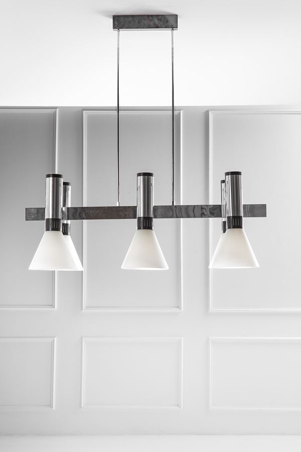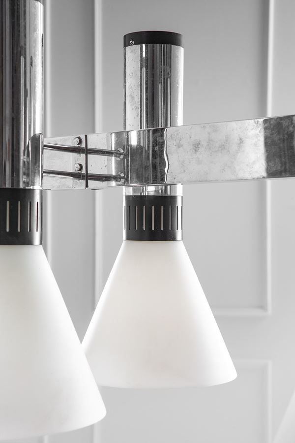 Ottone nichelato, metallo laccato, vetro opalino satinato.