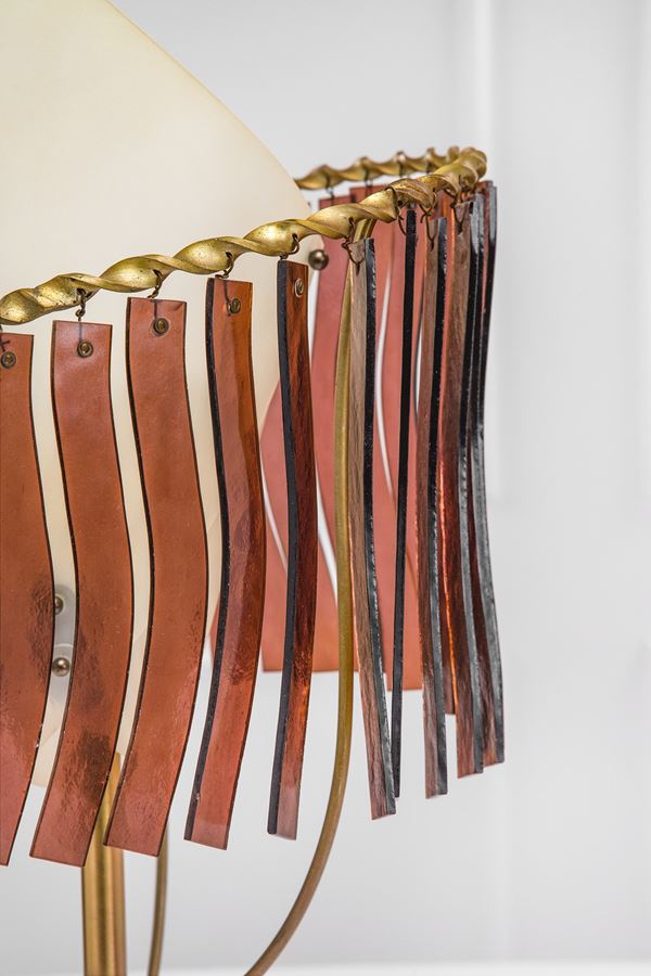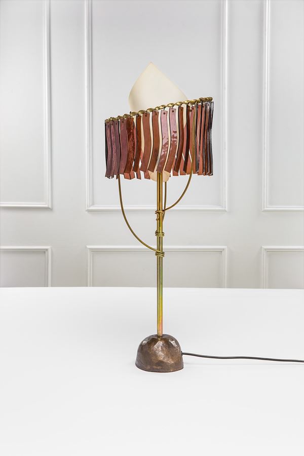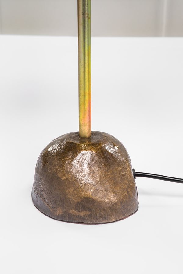 Policarbonato opalino, strisce di vetro cattedrale molato ambra, acciaio zincato, fusione di ottone.