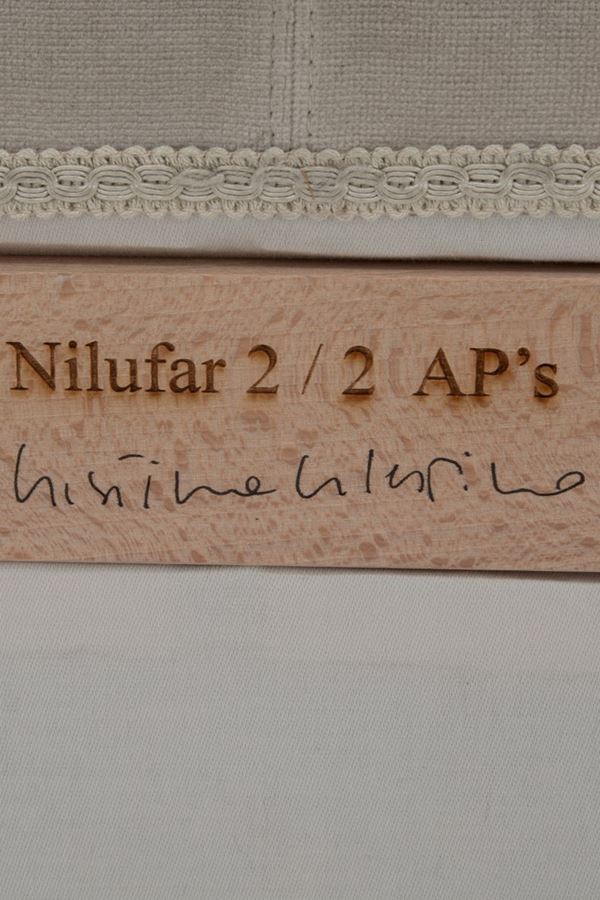 Targhetta in legno con numerazione, nome dell'editore e nome del designer: Nilufar 2/2 AP's Cristina Celestino.