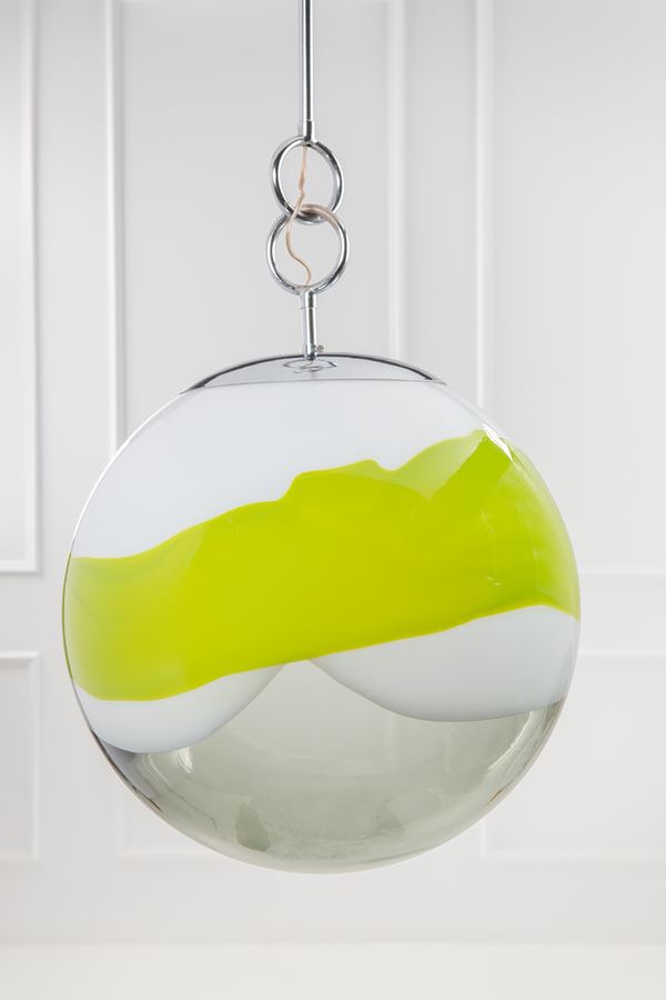 Metallo cromato, sfera in vetro trasparente con fascia lattimo e verde.