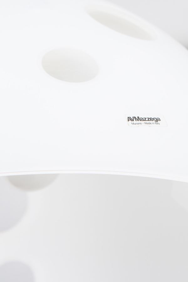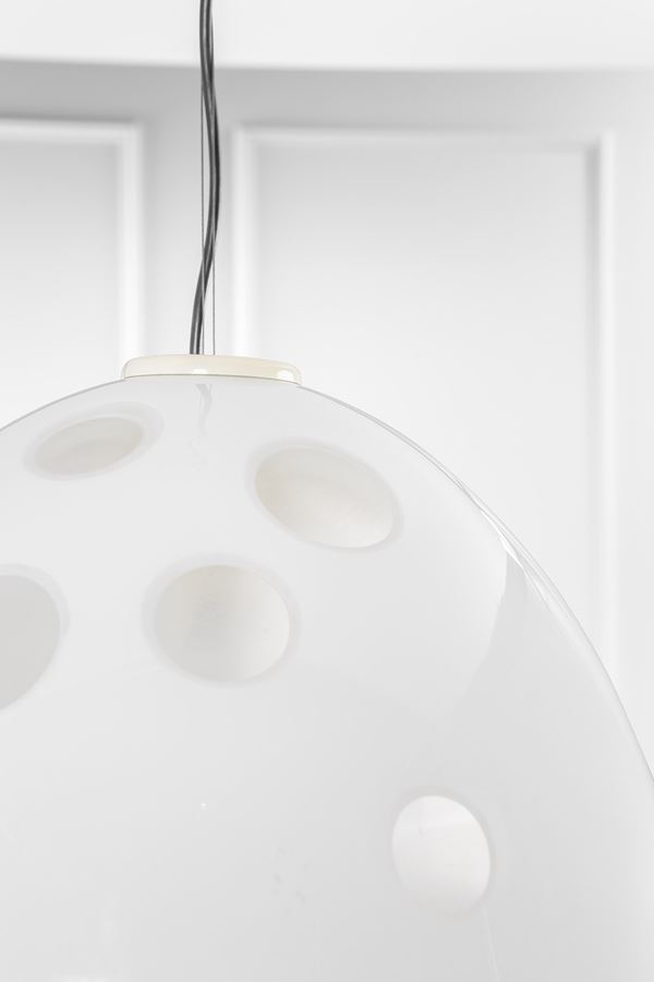 Vetro soffiato bianco con bolle trasparenti, metallo verniciato.