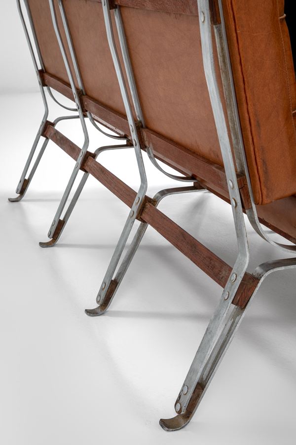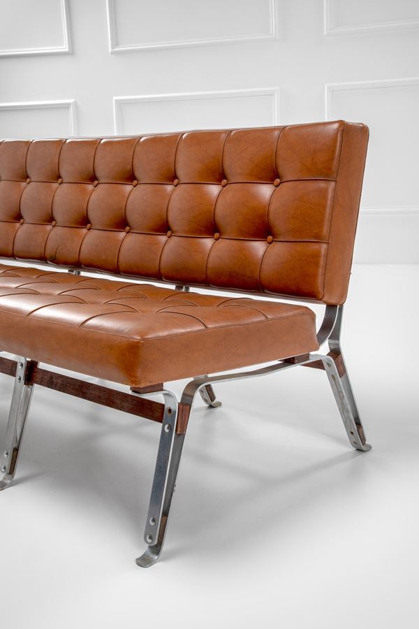 Acciaio a canna di fucile, legno, pelle capitonné.
