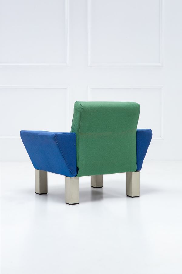 Struttura in legno imbottita e rivestita in tessuto policromo, metallo verniciato.