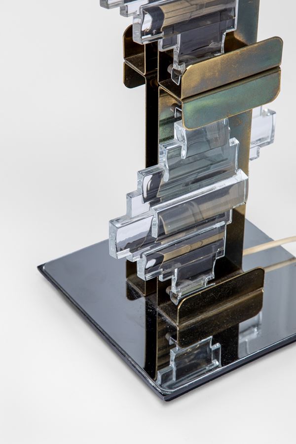 Acciaio cromato, acciaio ottonato, vetro trasparente.
