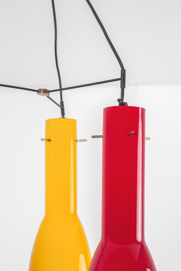 Metallo verniciato, ottone, vetro incamiciato colorato.