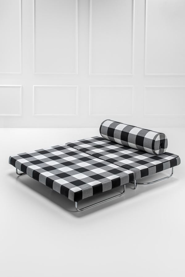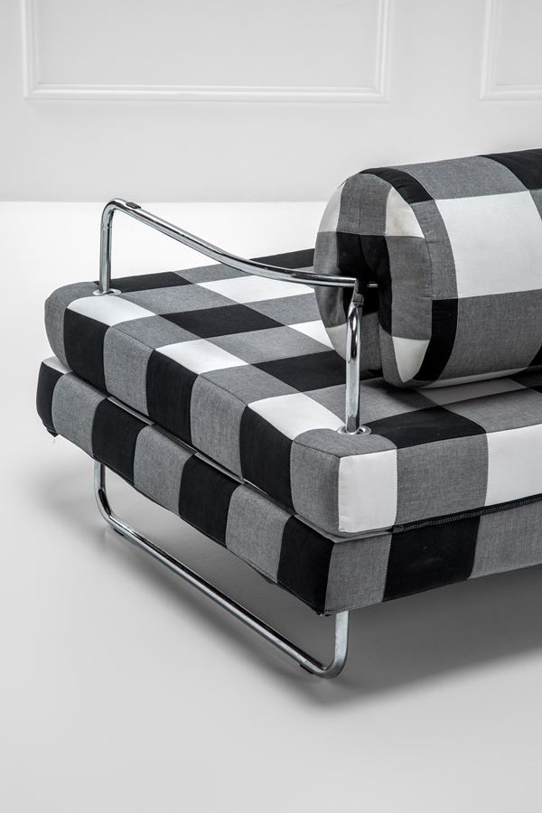 Tubo metallico cromato, schiuma poliuretanica, tessuto, doghe in legno.