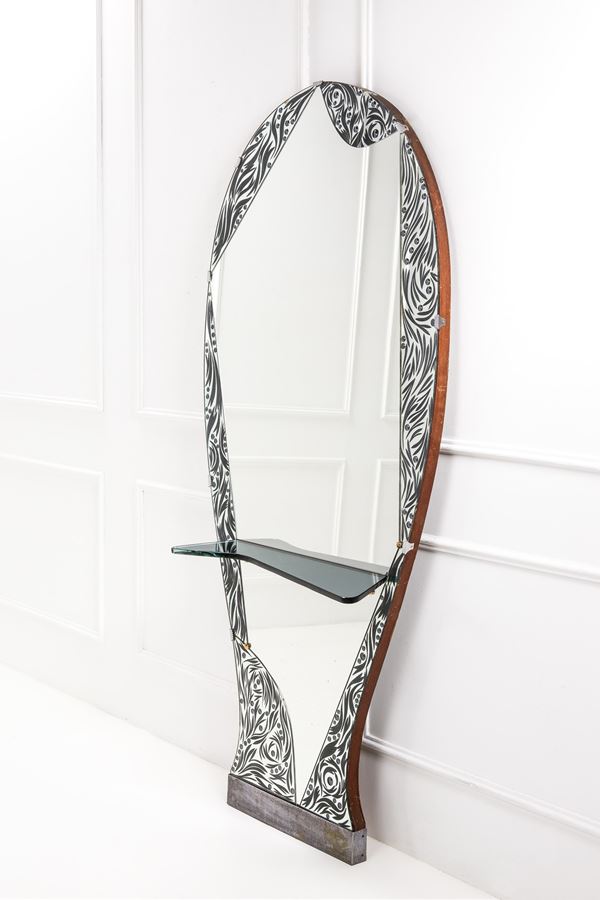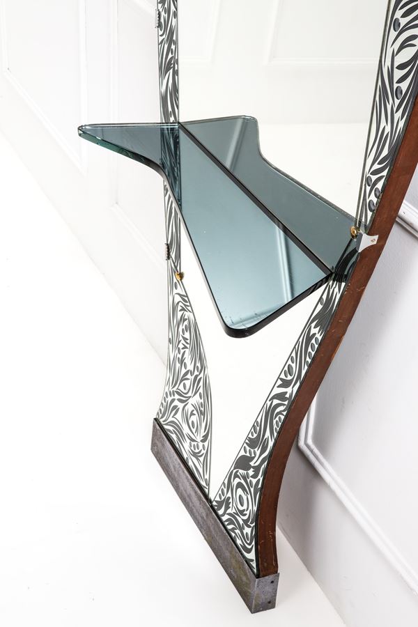 Vetro colorato e molato con decorazione incisa a rotella e specchiata in blu fumé, vetro specchiato, ottone.