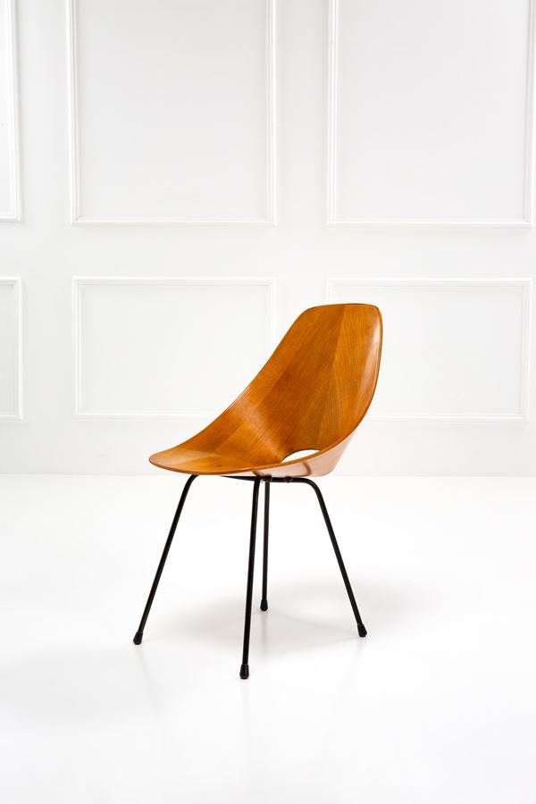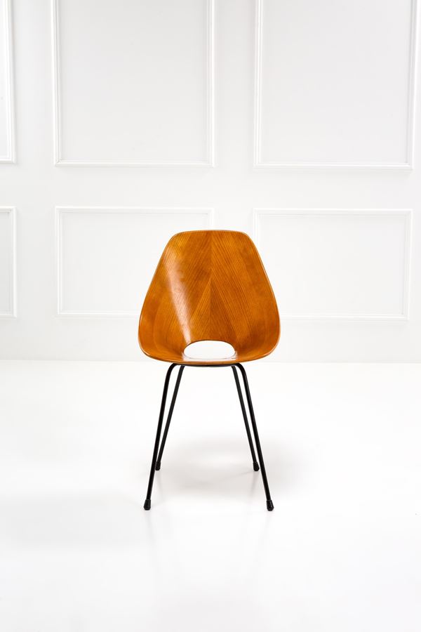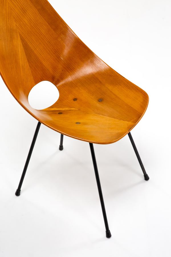 Compensato curvato impiallacciato, tondino metallico verniciato.