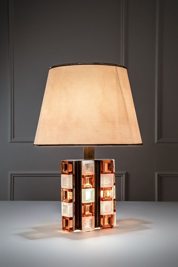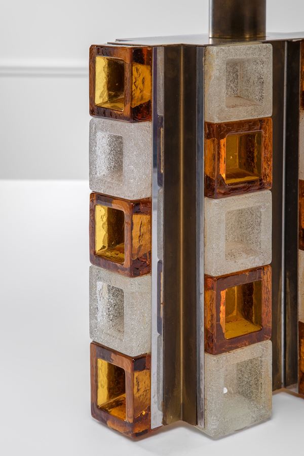 Metallo cromato, ottone, elementi in vetro ghiaccio e vetro ambra, tessuto.