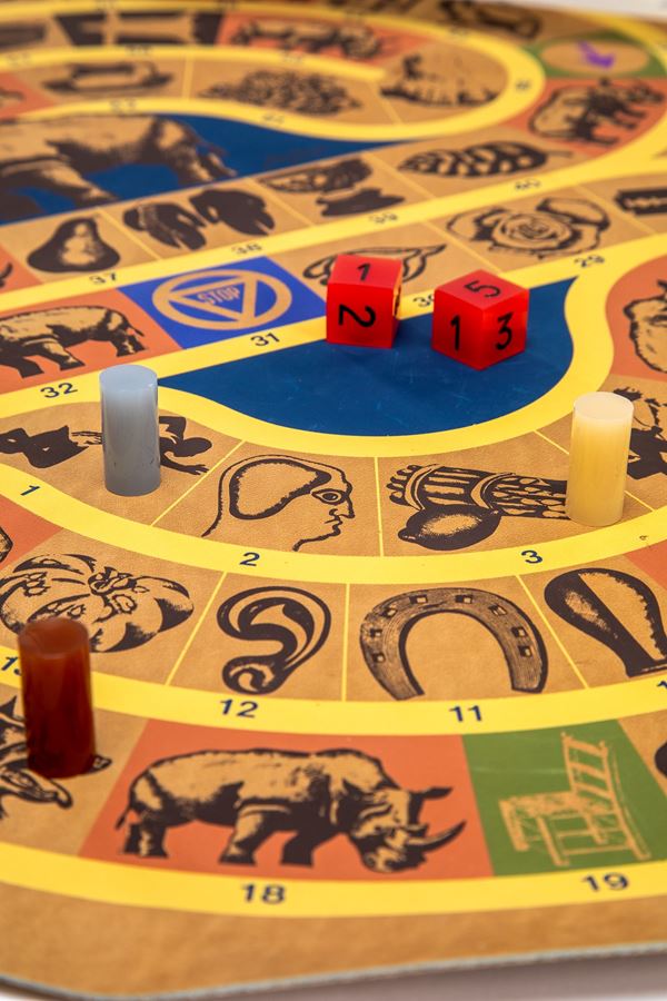 Serigrafia a sette colori su pelle sagomata, completa di istruzioni di gioco, pedine e dadi.