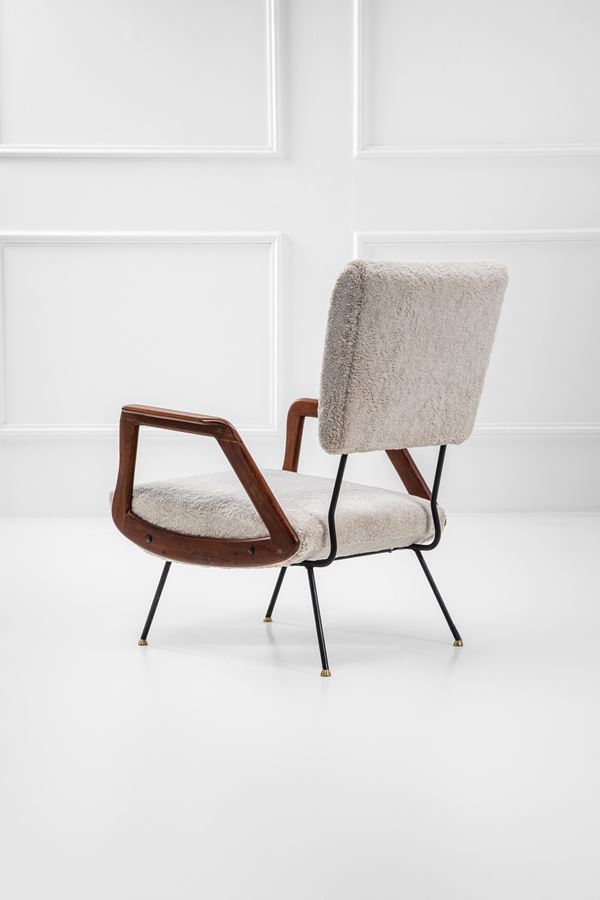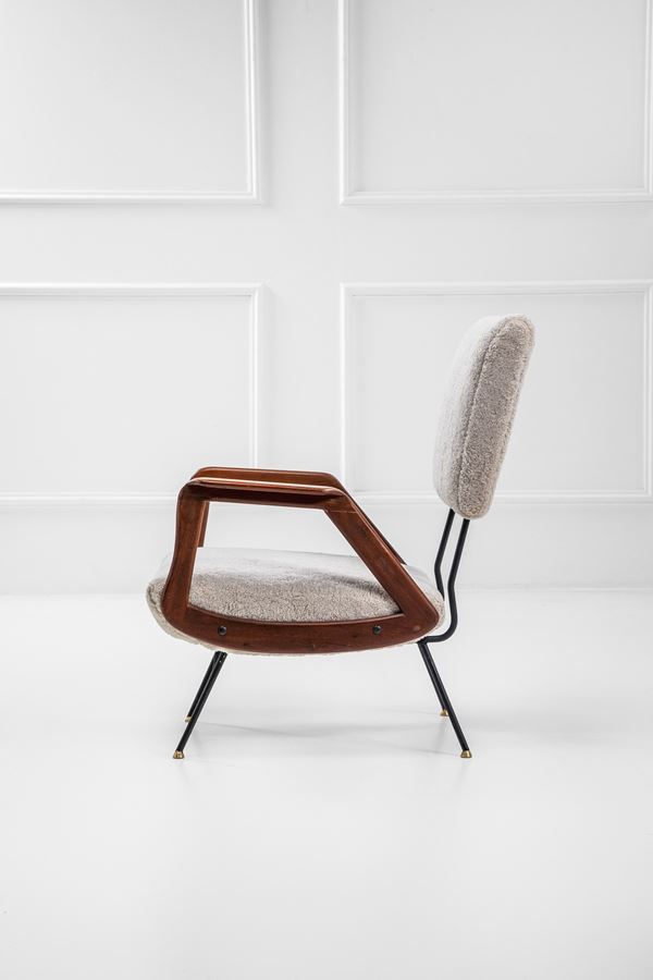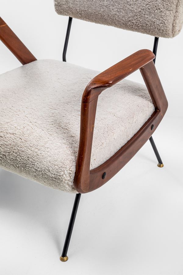 Legno sagomato, metallo verniciato, ottone, tessuto bouclé.