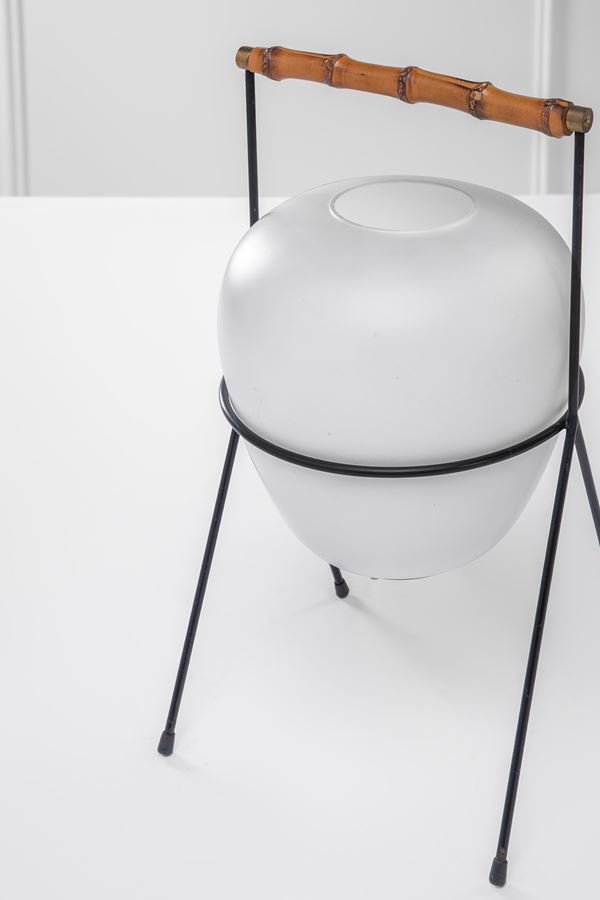 Metallo verniciato, ottone, bamboo, vetro opalino satinato.
