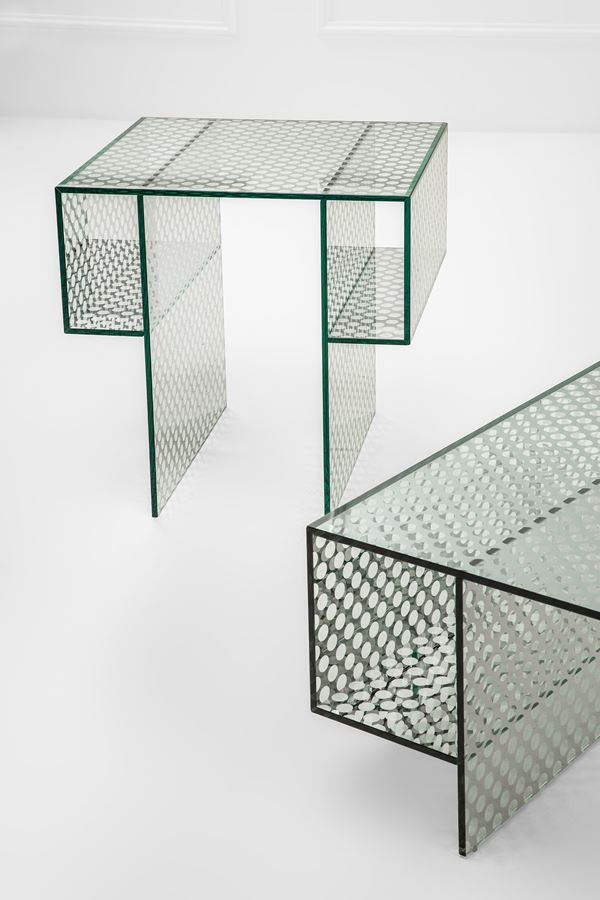 Cristallo specchiante su entrambe le facce, con un pattern decorativo a bolli trasparenti, che simula una lamiera traforata.