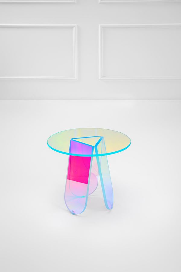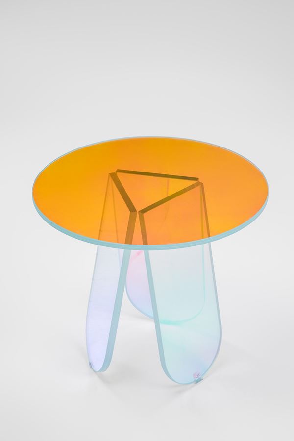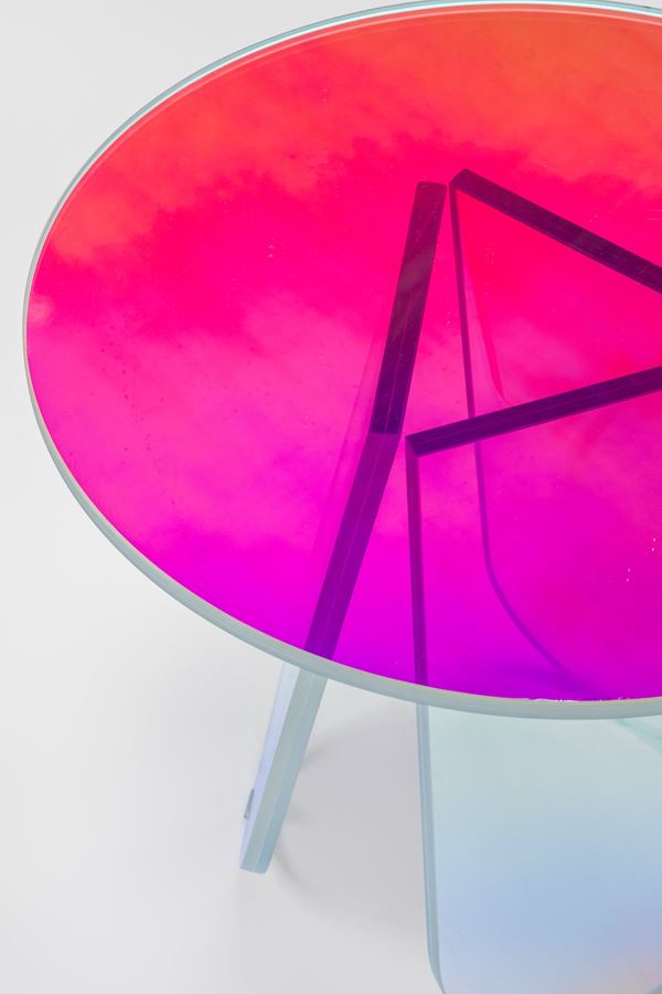 Cristallo stratificato e incollato con una speciale finitura multicromatica cangiante.