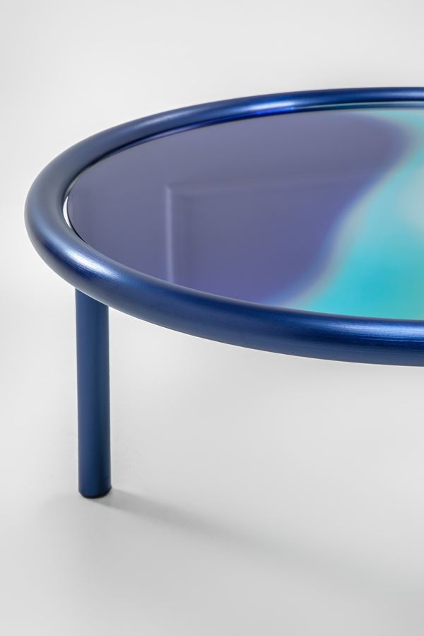 Metallo verniciato con finitura metallizzata, vetro stratificato su un fondo a specchio.