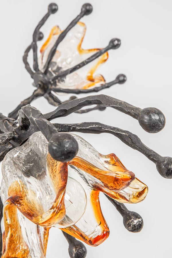 Ferro forgiato e brunito, vetro trasparente e vetro ambra.