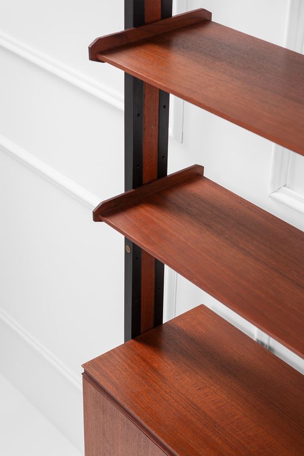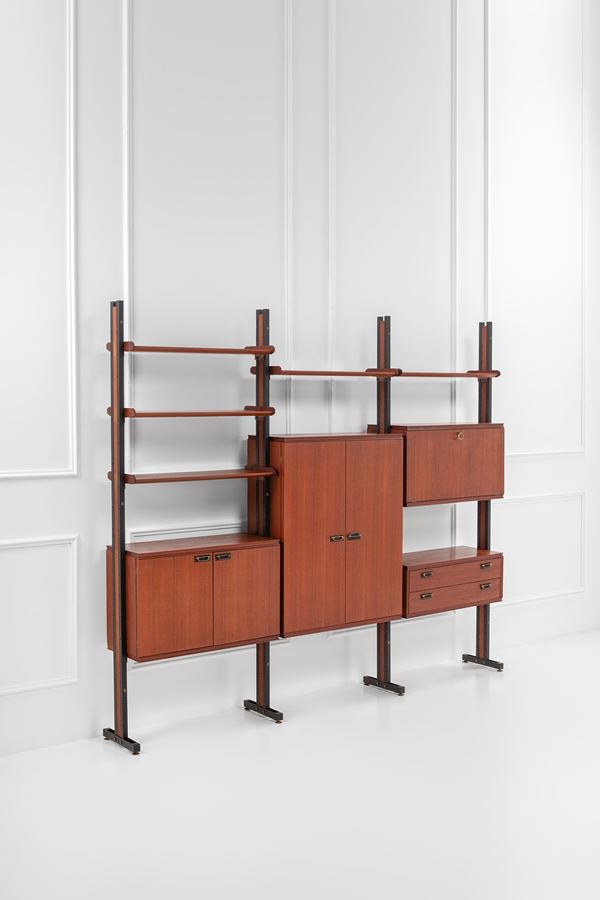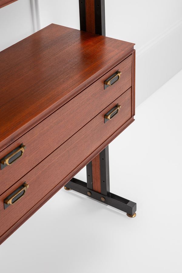 Composta da ripiani, due mobili contenitori ad ante, una cassettiera e un mobile a ribalta.