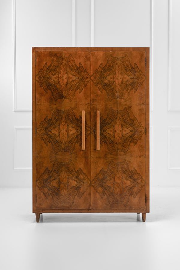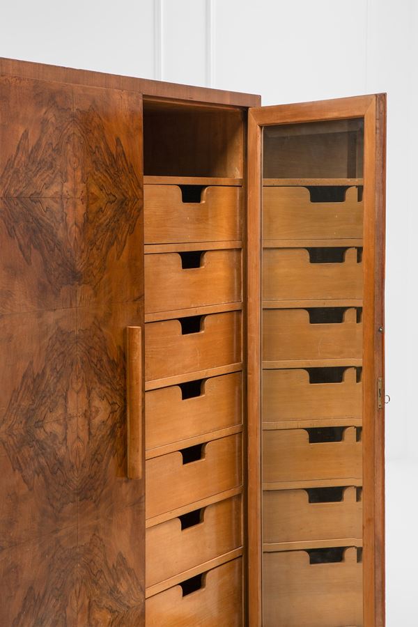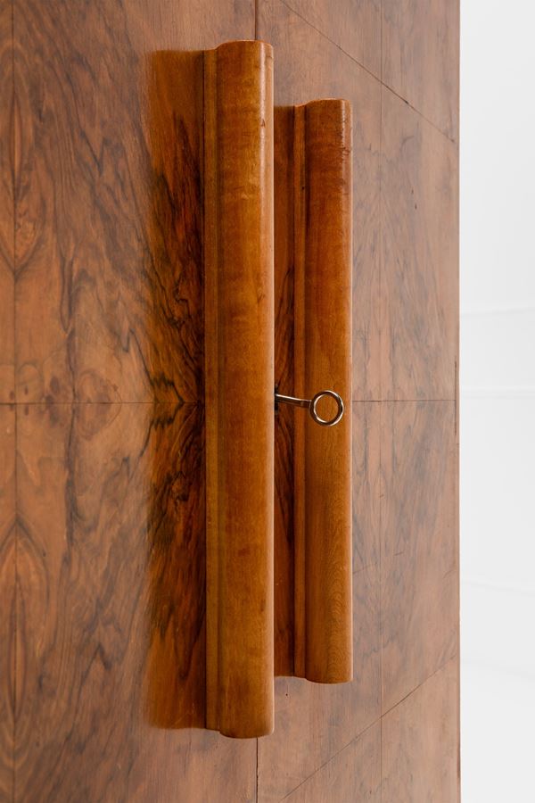 Legno impiallacciato in radica, legno impiallacciato, legno massello tornito, vetro specchiato.