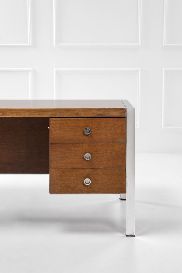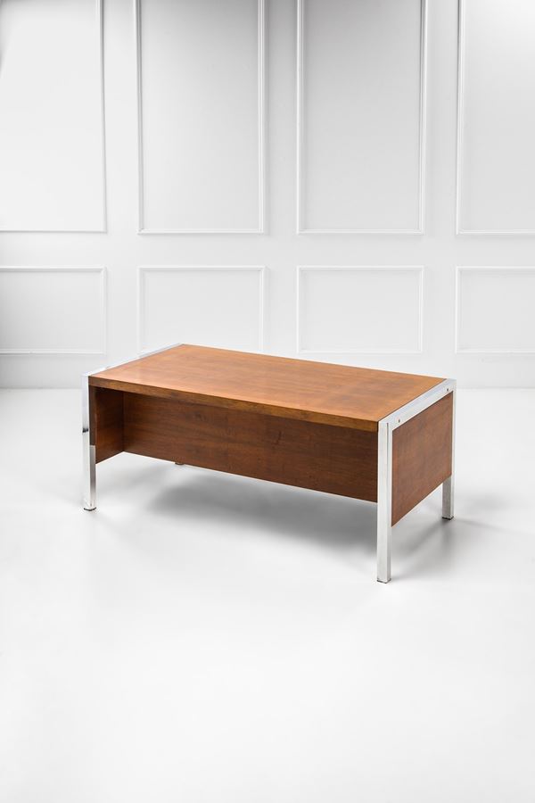 Legno impiallacciato, acciaio cromato.