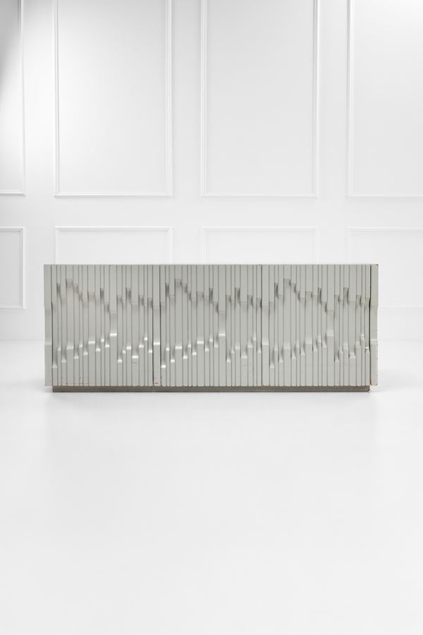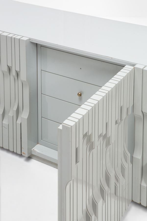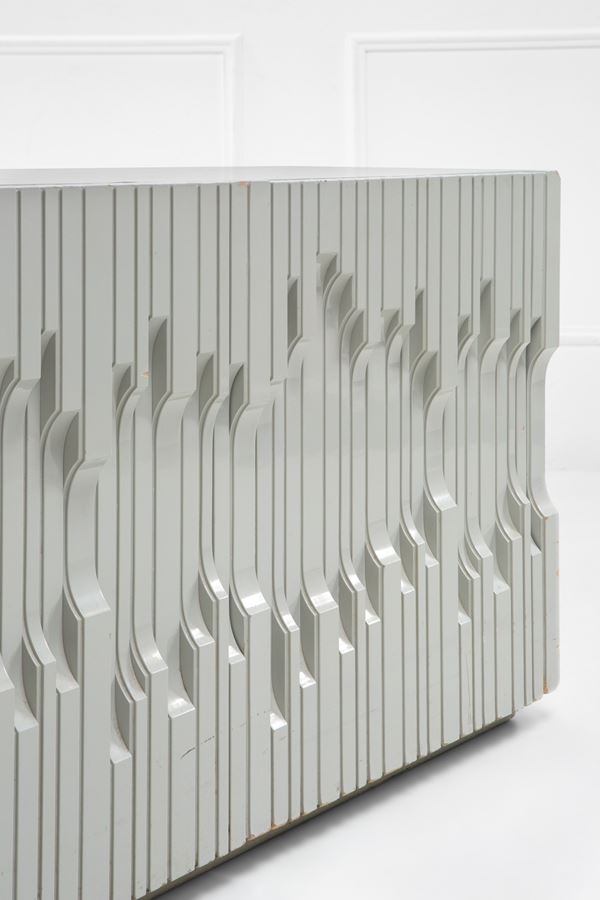 Legno massello lavorato a tavole di diverso spessore, sagomate e congiunte, e laccato a poliestere.