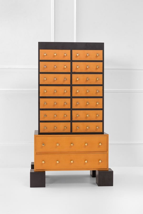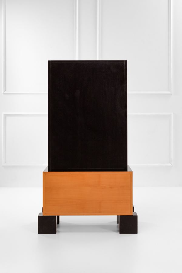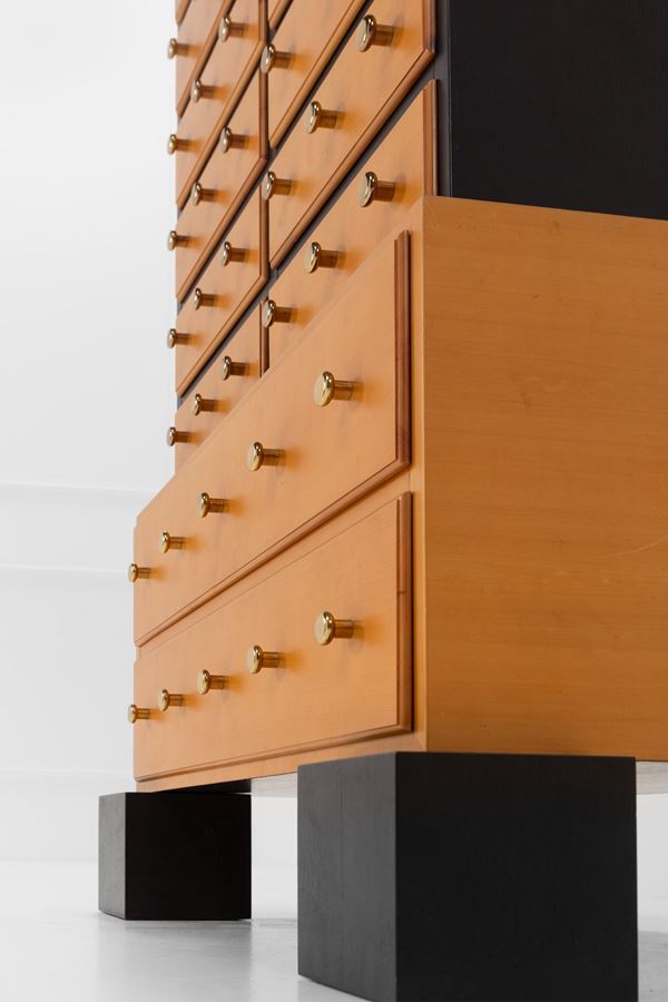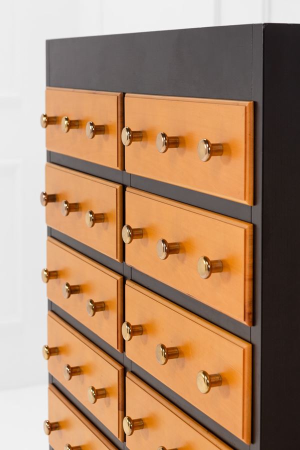 Legno impiallacciato, legno tinto, ottone.