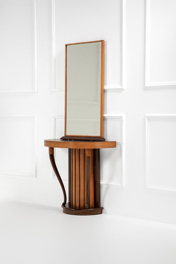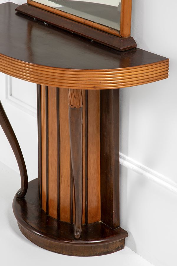 Legno tinto, legno impiallacciato, legno scolpito, vetro specchiato.