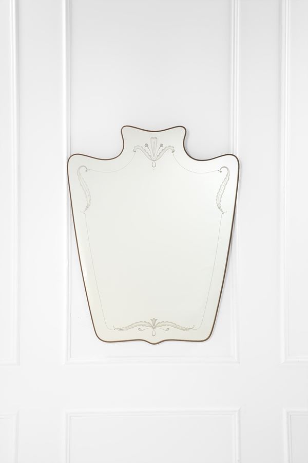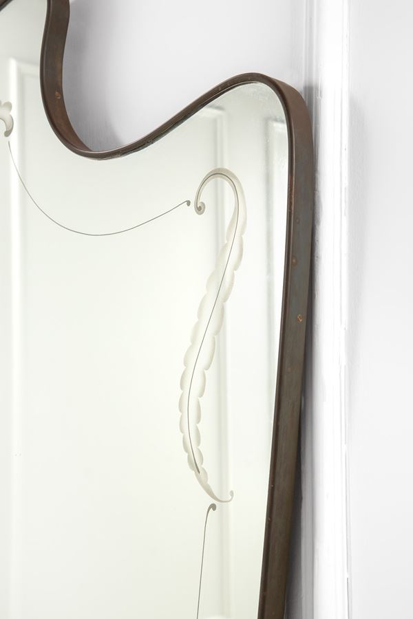 Ottone, vetro specchiato con decoro a motivi vegetali.