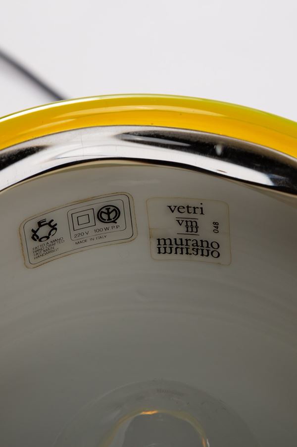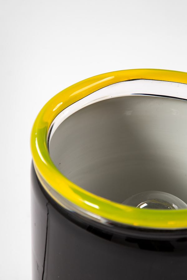 Vetro incamiciato nero e lattimo, bordo applicato in vetro giallo e trasparente.