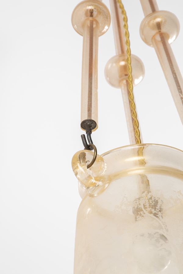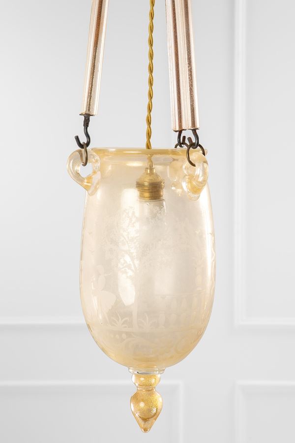 Vetro di Murano con inclusione d'oro e decoro inciso, metallo.