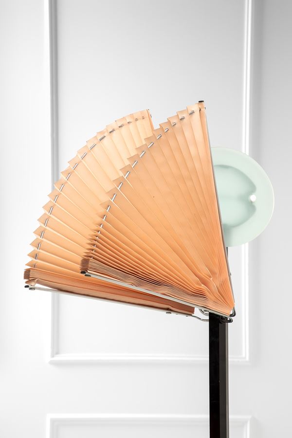 Metallo verniciato, vetro satinato, tessuto ignifugo plissettato. Intensità luminosa variabile.