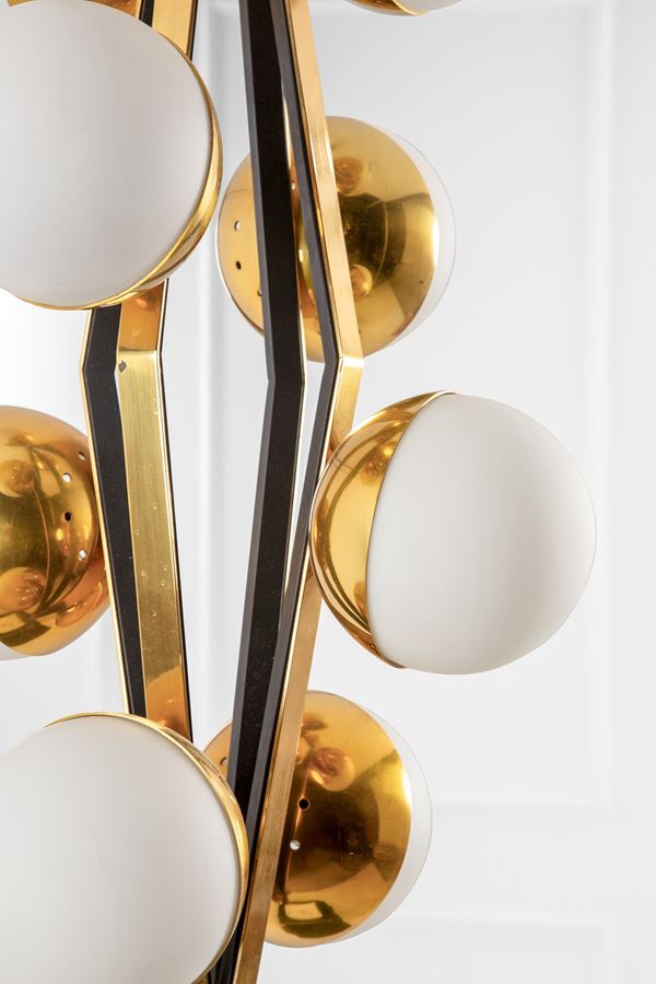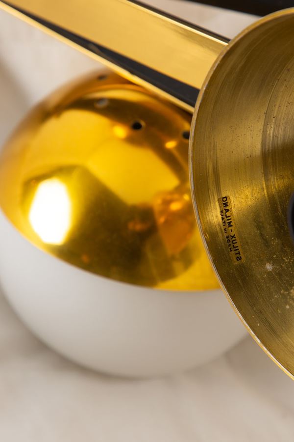 Ottone lucido, metallo verniciato, vetro opalino satinato.
