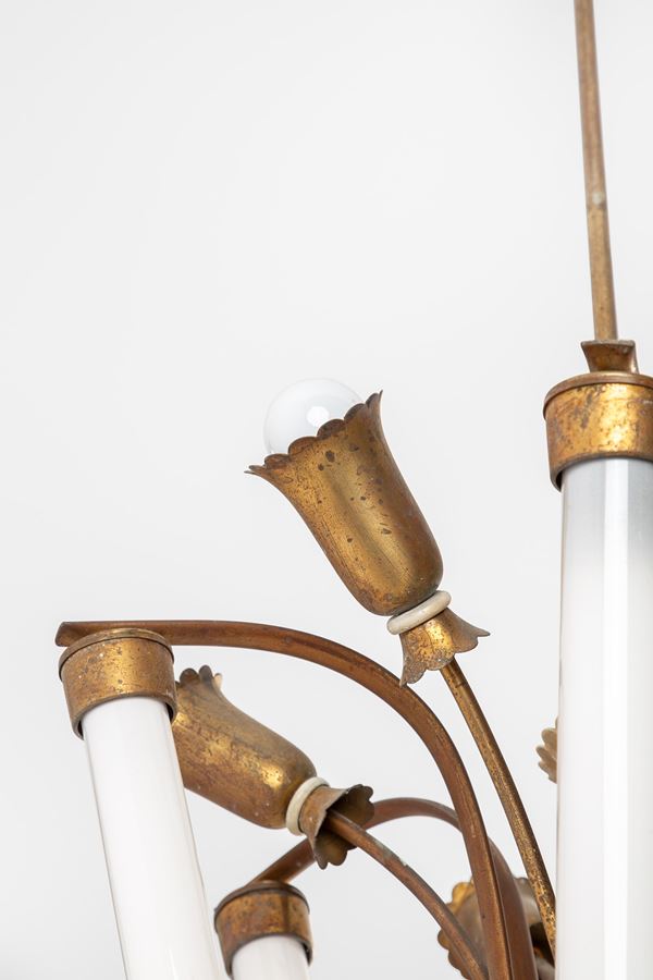 Metallo verniciato, ottone, sei elementi illuminanti al neon.