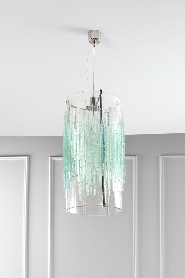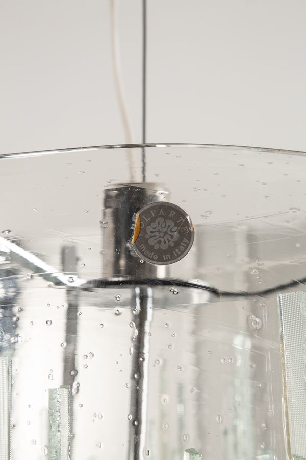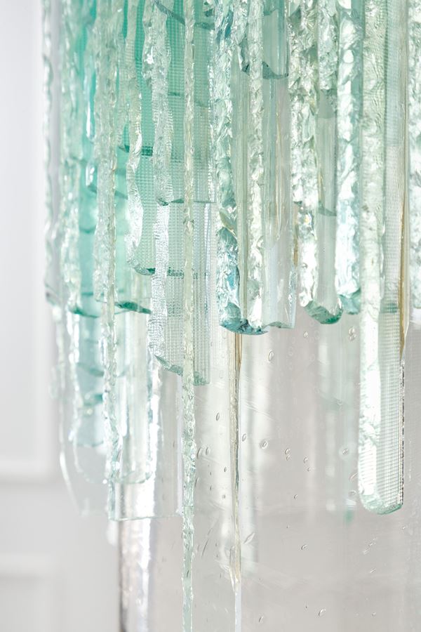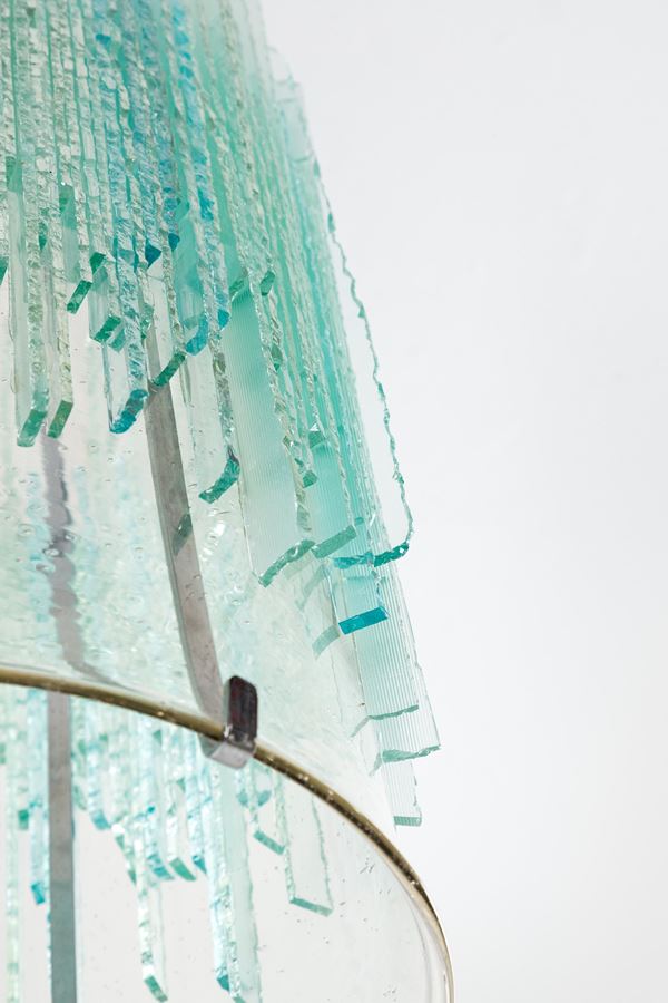 Vetro trasparente con applicazione di bacchette di vetro lavorato a spacco, metallo cromato.
