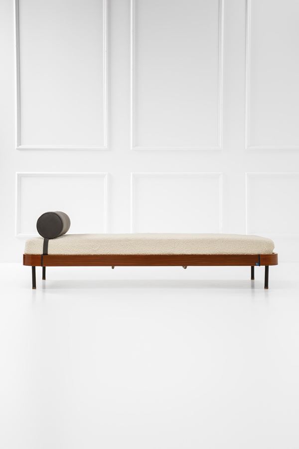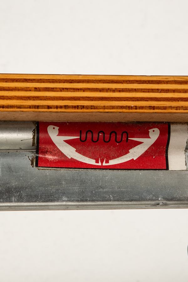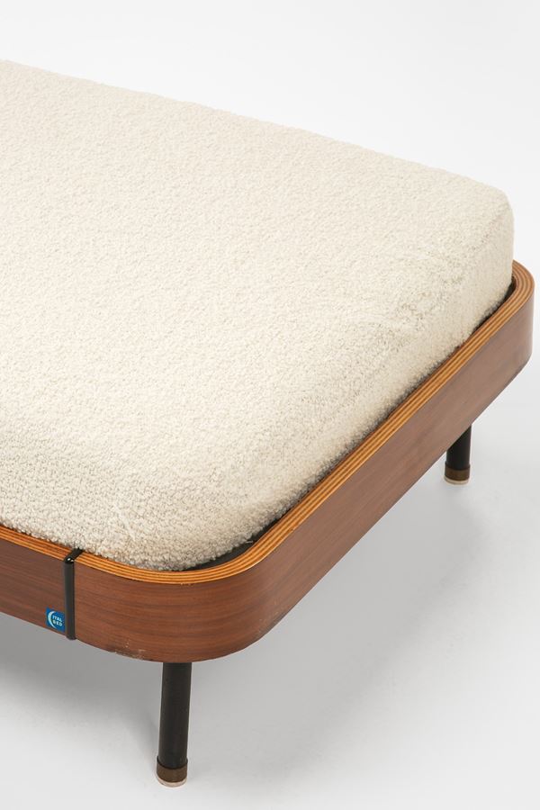 Legno multistrato curvato, metallo verniciato, tessuto.