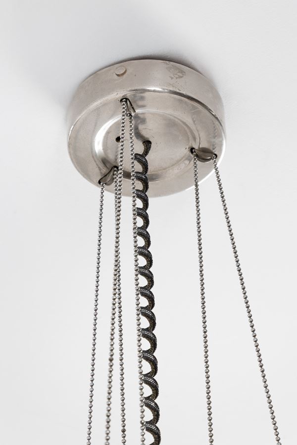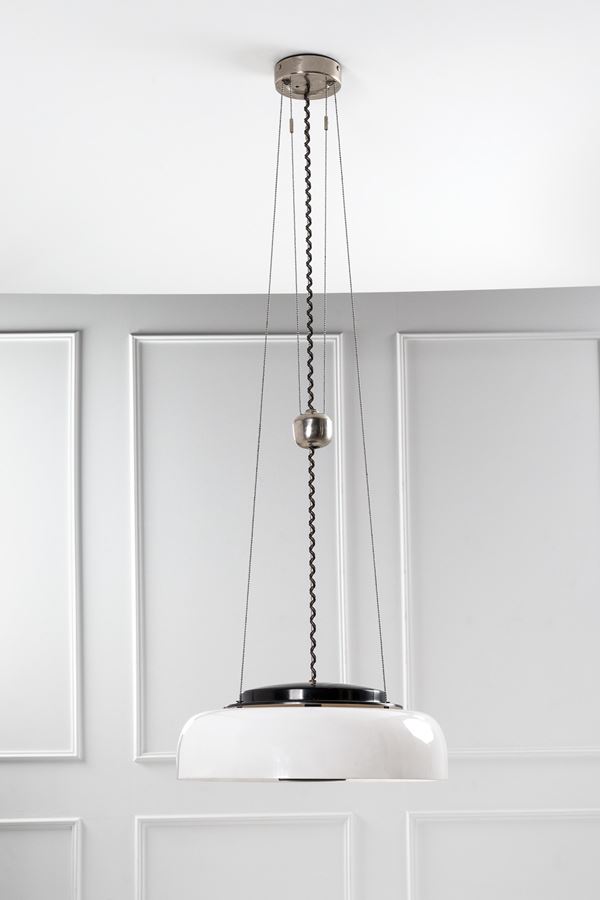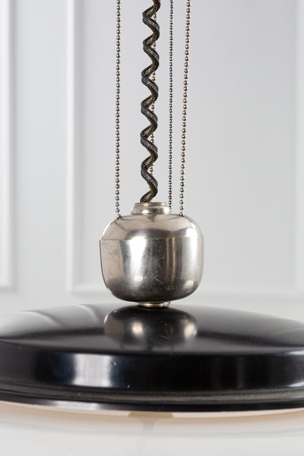 Alluminio laccato, metacrilato opalino, metallo cromato, saliscendi con carrucole e catenelle a sferette.