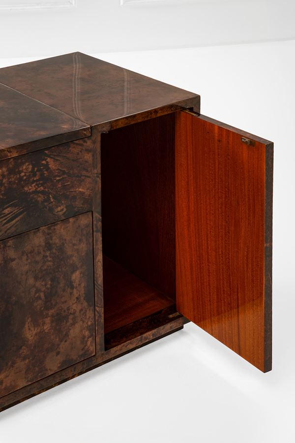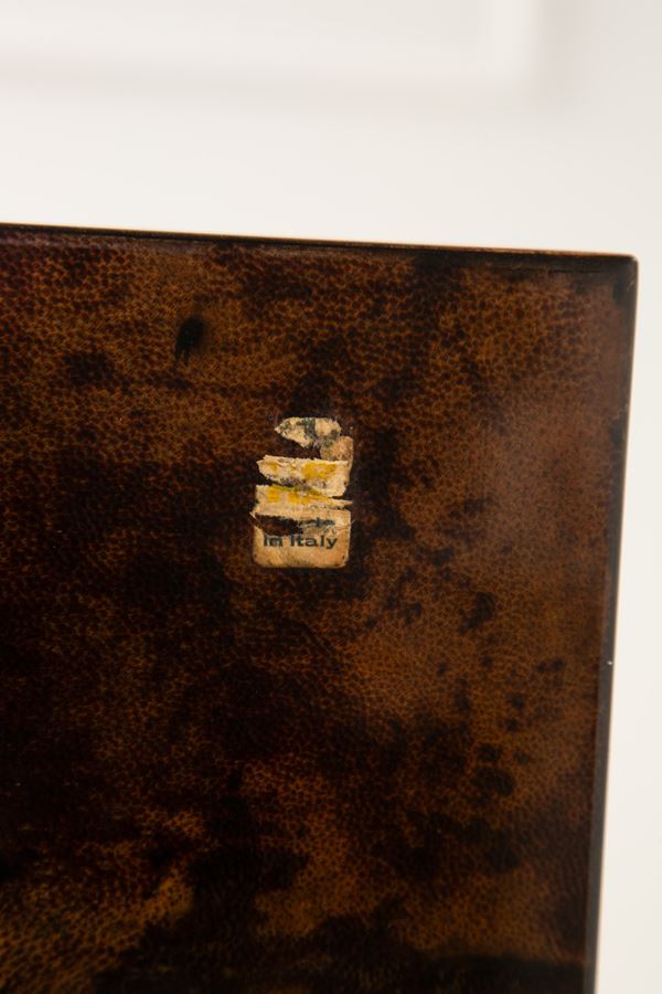 Legno rivestito in pergamena tinta e vetrificata, legno impiallacciato, ottone.