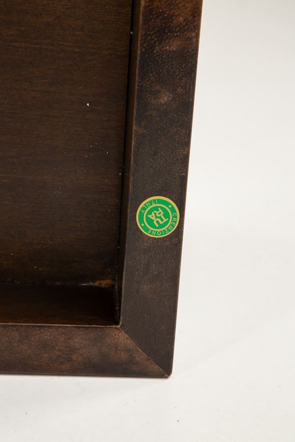 Legno rivestito in pergamena tinta vetrificata.