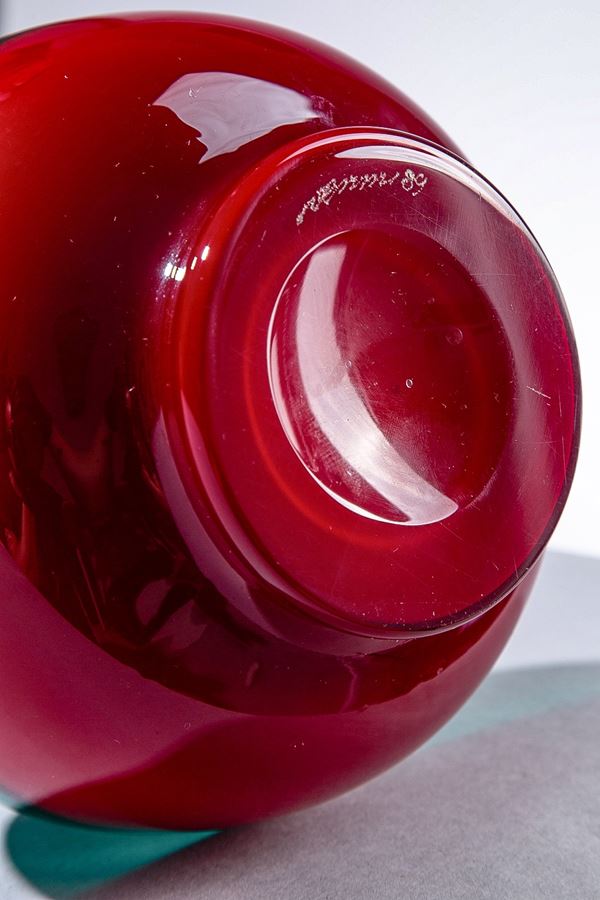 Vetro soffiato lavorato a incalmo nei colori verde e rosso.