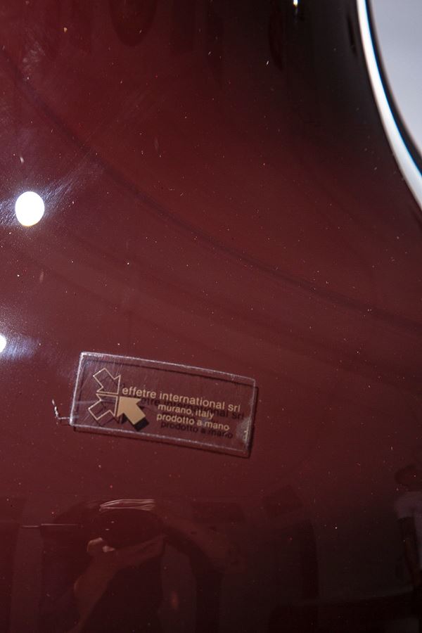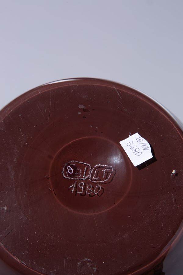 Vetro soffiato prugna con filo nero applicato al bordo,