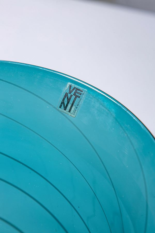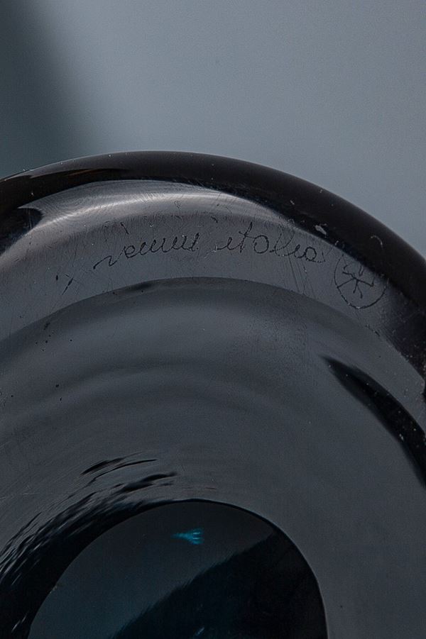 Vetro soffiato blu decorato con canne lattimo disposte a spirale.